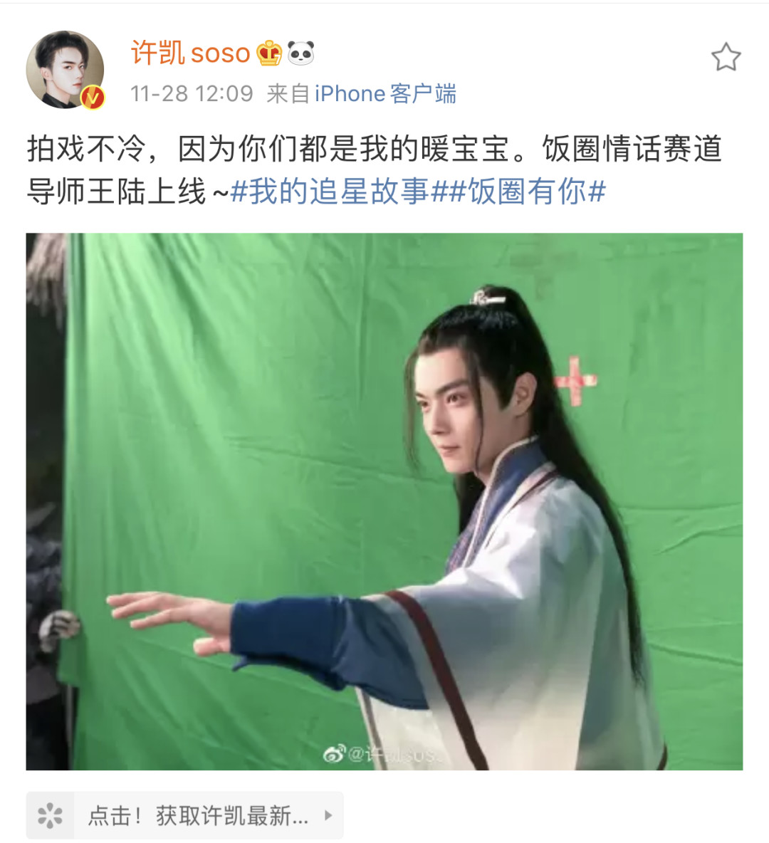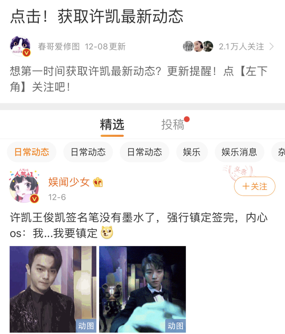 毕竟他本人就是演艺圈“沙雕男孩”代表人物,点进“获取许凯最新动态”的tag,第一个迎面而来的讯息就已经点亮了笑点值。