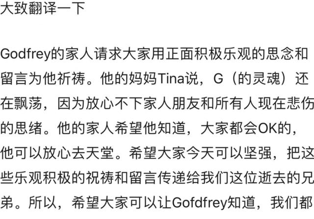 高以翔去世之后,他的母亲通过高以翔朋友表示,希望大家为他祈祷,因为他的灵魂放不下家人朋友,一直还在飘荡。希望大家用积极乐观的祝祷让他安息。