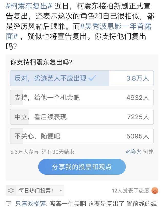 近日,柯震东接拍新剧正式宣告复出,还表示这次的角色和自己很相似,都是经历风霜后赎罪。而#吴秀波息影一年首露面# ,疑似也将宣告复出。#你支持他们复出吗?##该不该原谅那些劣迹斑斑的艺人#引发讨论。
