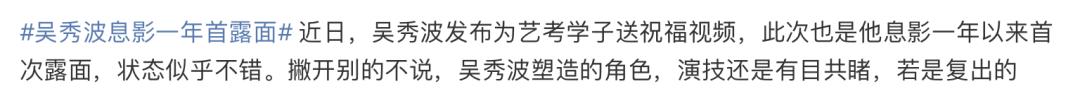 艺人吴秀波近日录制视频祝福艺考生,视频中,吴秀波面带微笑地说:“我是吴秀波,祝学子们艺考一切顺利,长路漫漫未来可期,祝你们金榜题名,加油”,状态看上去很不错。众人猜测疑是有复出打算。