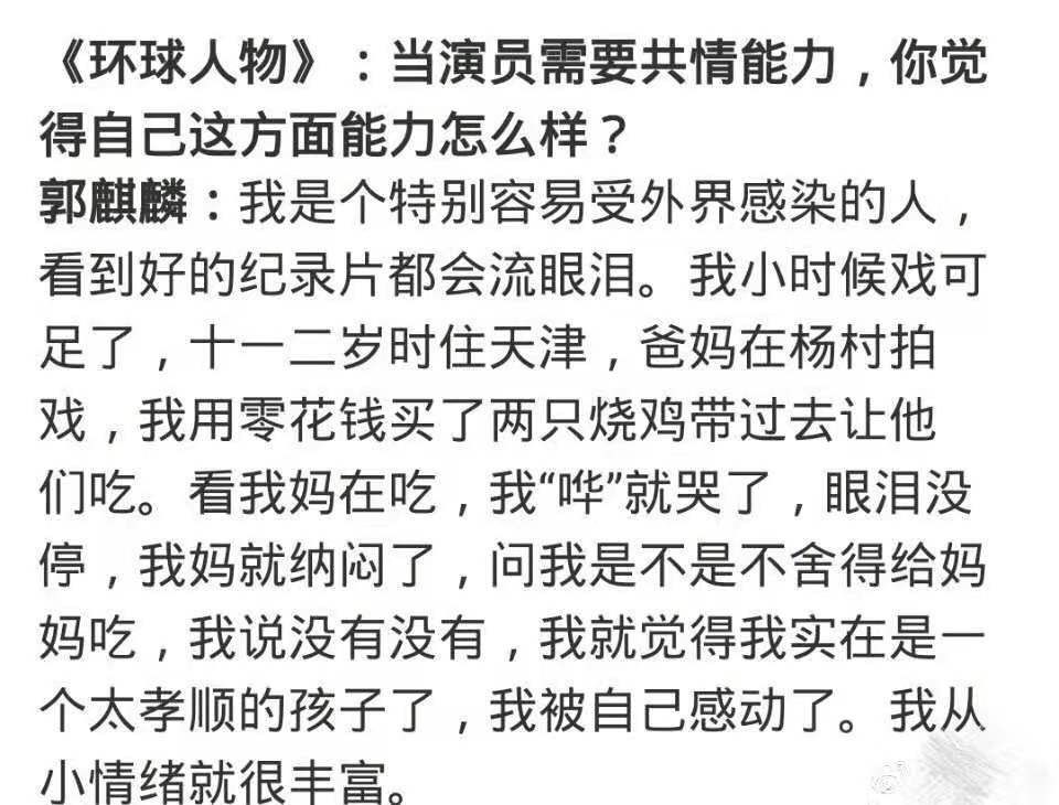 要评价一部剧的演技,当然是要看低谷了,这么一看非科班出身,跨界出演的郭麒麟怎么看也是这个低谷,唯一能和演戏挂钩的就是北影导演系毕业的师父于谦了。