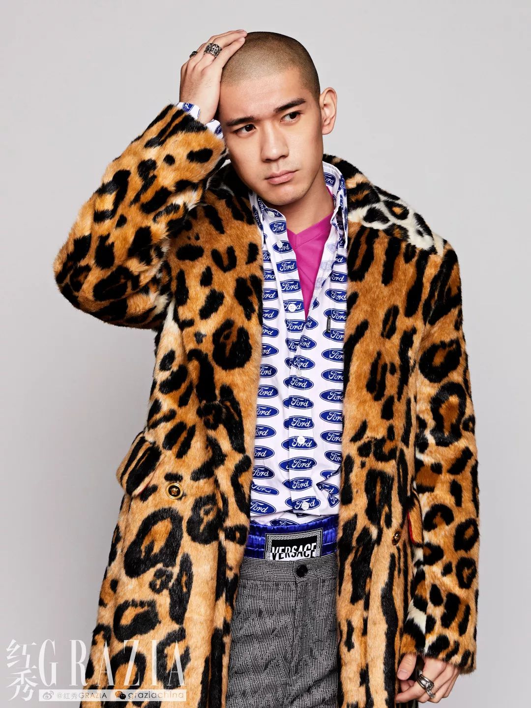 豹纹大衣、印花衬衫、背心上衣、短裤、细格纹灰色西装裤均为Versace