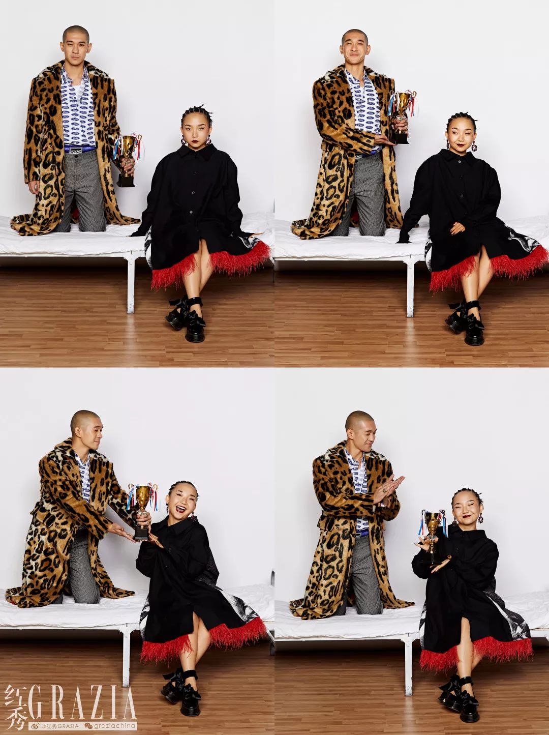 左:豹纹大衣、印花衬衫、背心上衣、短裤、细格纹灰色西装裤均为Versace