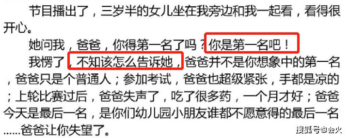 面对3岁的女儿“爸爸,你是第一名吧”的提问,刘洋甚至不知道如何回答,内心五味陈杂。节目播出后,面对朋友的鼓励和安慰,自己也只能说一句“谢谢你们”。