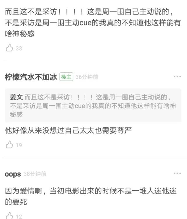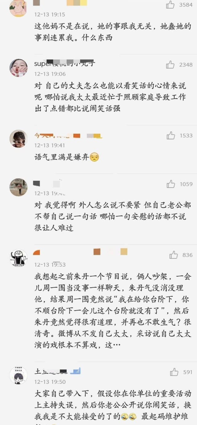 不少人对于这番话都是嗤之以鼻的,真的觉得朱丹在婚姻中太卑微了。周一围一次又一次的态度和言论,让大家觉得似乎只有他是有事业的,他的事业很重要,他坚持自我,是圈中清流,而自己的太太似乎并没有那么重要。在这种时刻,不说安慰吧,也不能公开的说这样的话,是在撇清自己,还是在落井下石呢?