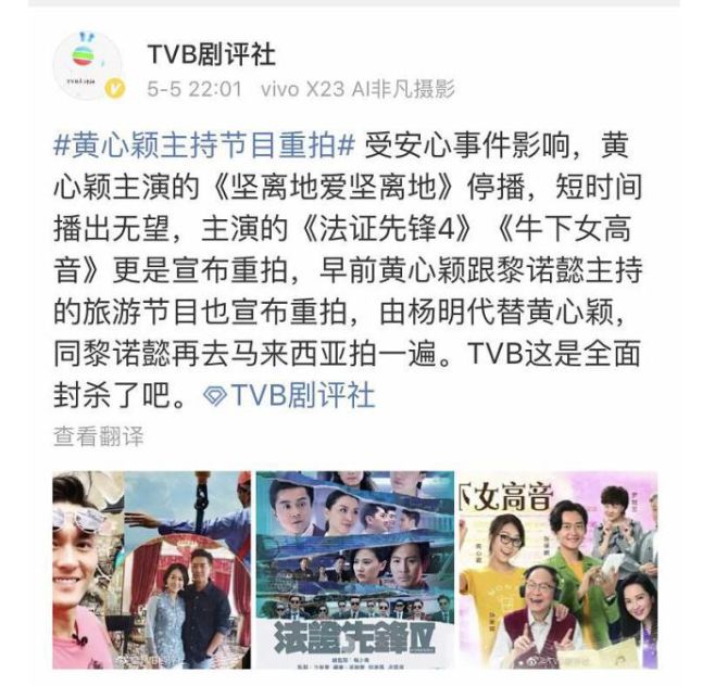 而黄心颖出演的其他电视剧,或者重拍或者叫停,大有被港媒封杀的架势。