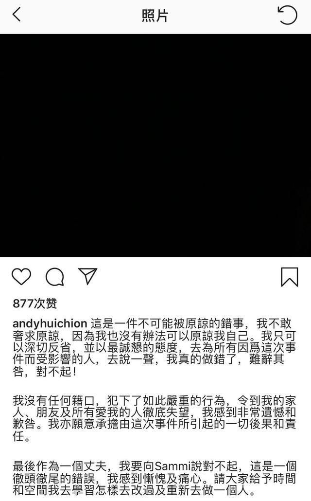 并在自己的社交平台上发出了长长的道歉信,极力挽回自己“丈夫”的角色。其实,当时许志安的状态就已经说明了自己的立场,跟黄心颖划清界限。