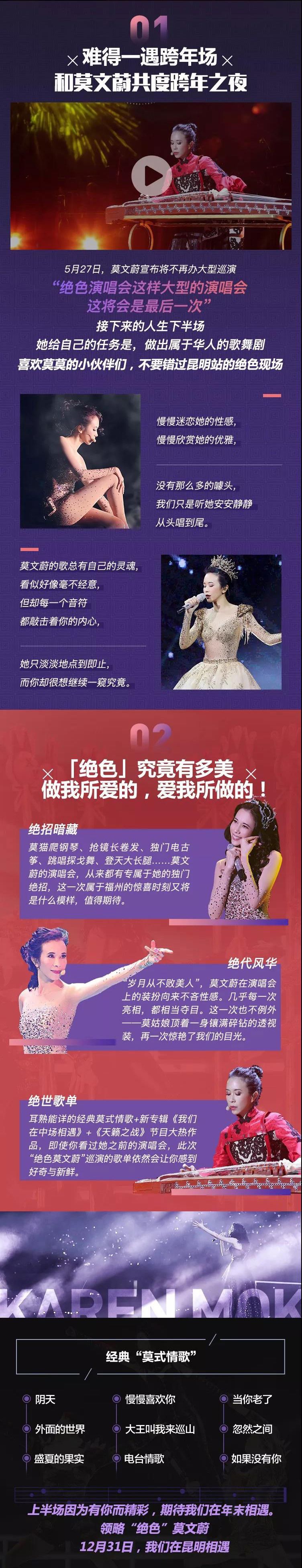 “绝色莫文蔚世界巡回演唱会”昆明站作为2019年收官站,定档12月31日,必定与众不同,演出也升级为“巅峰跨年夜”,据悉开场时间已经定在21:30,Karen将与来自全国各地的莫鱼们一起在“绝色莫文蔚”巅峰跨年夜昆明站的演唱会上共度跨年!