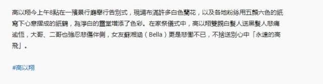 根据台媒的报道称高以翔的父母白发人送黑发人极其不舍,而大哥和二哥更是强忍悲伤,最可怜的就要数女友bella了,不仅悲痛不已,而且在高以翔的灵位前哭了好长好长时间。