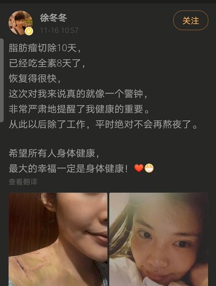 当很多人都以为徐冬冬是在医院整容才出事故时,她发微博称自己只是切除长在颈部的脂肪瘤,手术时不小心伤到了动脉,后来她还晒出了伤口,分享恢复进度。