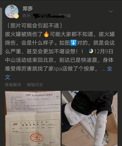就在昨天,演员邓莎在网上分享了自己拔火罐时遭遇的惨痛经历,邓莎结束活动后回北京,身体比较难受就找了一家理疗店按摩并拔火罐,没想到出现失误,皮肤就被烧伤了,从图片来看,部分皮肤已烧烂。