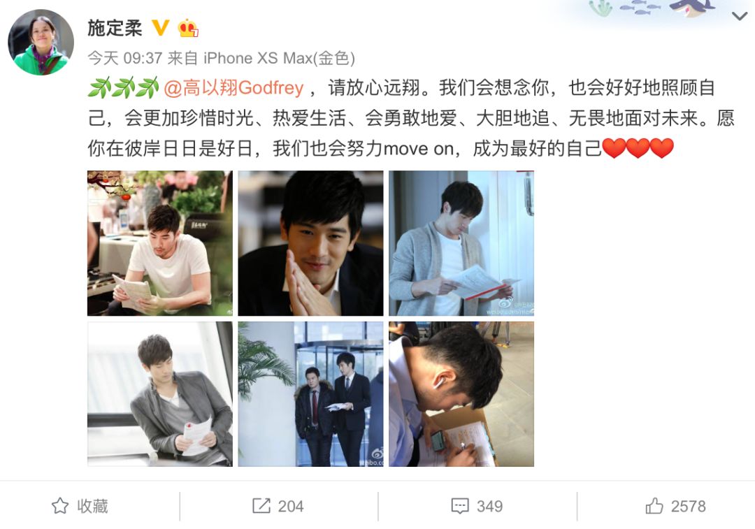 编剧施定柔也发文,逝者已逝,生者要更好的活,我们会带着对高以翔的思念更好的生活下去。