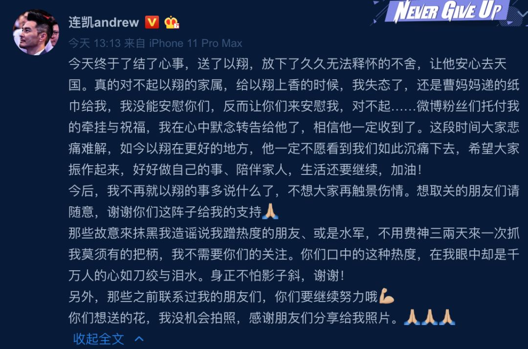 作为王沥川的哥哥王霁川,连凯也在微博发布了长文,来对自己的弟弟做最后的告别,这段时间他顶住压力一直在为高以翔发声,获得了不少粉丝的认可,但也有很多人质疑他是蹭热度。
