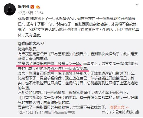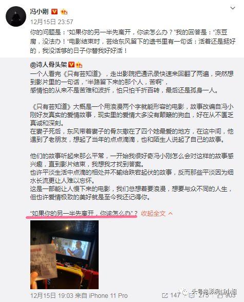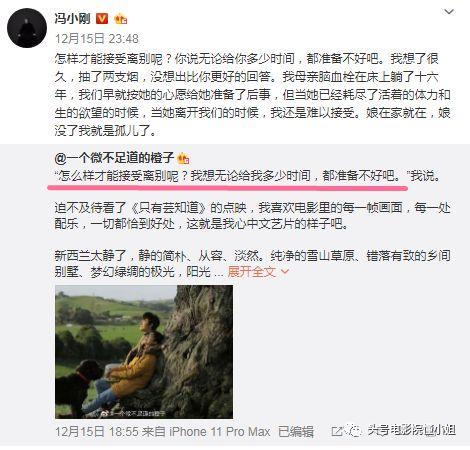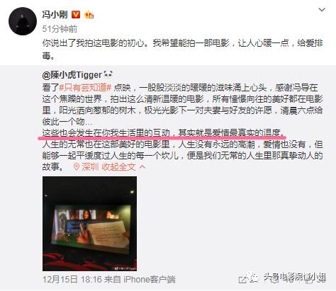 12月15日深夜,冯小刚十分罕见地在网上连发6条消息,回复了几位网友关于《只有芸知道》的感悟,其中就包括前面提到的这位网友。