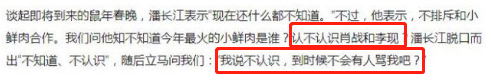 据悉,当天潘长江是在录制一档节目,录制结束后接受访问。在被问到认不认识肖战和李现时,潘长江直言“不知道、不认识”,随后还十分担心的表示会不会有人骂他。