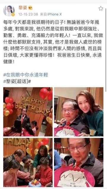 12月15日,黎姿在自己社交平台晒出为父亲庆生的照片,并大赞父亲的为人处世,自己一直以父亲为榜样,还称爸爸在她眼里永远年轻,字里行间尽显对父亲的温暖。在照片中可以看出当天的生日会装扮的非常喜庆。