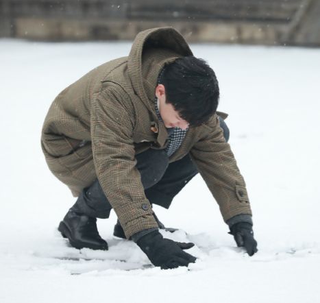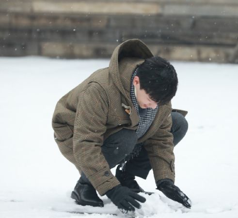 邓伦捧起地面上的雪,样子认真十分专注,不一会儿堆成了一个小山丘。此时的邓伦望向远处,露出开心的笑容,宛如孩子一般,耳朵冻得有些微红。看来北京这天气着实冷啊,邓伦的御寒装备也很是齐全,脚踩皮靴,戴着手套,应对这寒冷的天气。