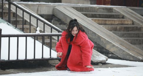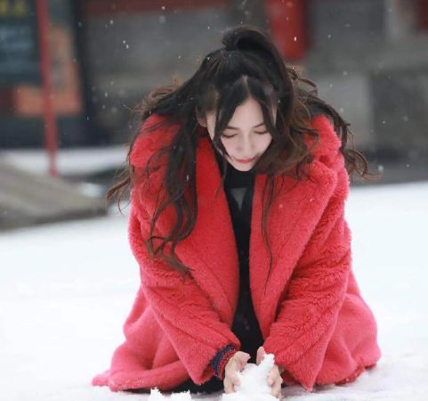 一旁的baby则是穿着大红色的毛绒外套,在一片洁白的雪地里十分显眼。她今天一改往日披着大波浪卷发,反而是将头发高高扎起,梳成马尾,看起来宛如一个娇俏的小姑娘,减龄了不少,看起来活力满满。baby玩着身旁的雪,展露笑颜,笑容颇为明媚。