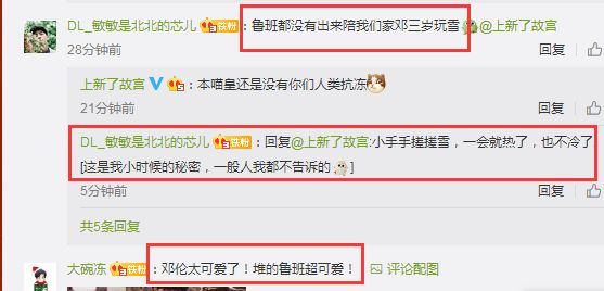 有网友在动态下评论,一些网友说,“鲁班都没有出来陪我们家邓三岁玩雪”、“邓伦太可爱了!堆的鲁班超可爱!”、“啊啊啊小伦糯米团子”、“好羡慕他们能在故宫堆雪人”,网友们纷纷夸赞邓伦,并直言羡慕他们能在故宫玩雪,评论区里一片欢乐。祝愿他们玩雪尽兴开心。