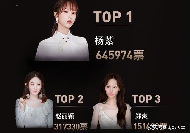 所以在这一榜单中,杨紫的投票目前是最高的,即便是位列榜单第二第三的赵丽颖和郑爽,也仅仅刚超过杨紫数量的一半。