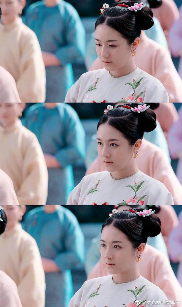 在《梦回》的现代戏份中,李兰迪脸两侧的头发垂下来遮挡住了脸,从视觉上修饰了脸型。当穿越回清朝之后,大光明+旗头,毫无遮挡,显得颅顶低,对圆脸萌妹李兰迪来说不太友好。