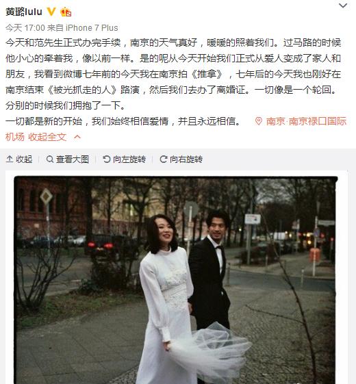 于是很多人顺藤摸瓜来到黄璐的微博,这位粉丝只有88万的女演员确实在网友和观众心目中没啥名气和知名度。看照片确实长得很普通,和我们身边普通妇女没啥差别,看不出是演员或者明星,但从她的微博可以看得出很有个性。一方面,黄璐宣布离婚,说辞很平静,一个女人,与丈夫离婚,结束七年的爱情,如此心平气和,以后还是家人和朋友,看得出很大度,不像一般女人离婚会失落或者寻死觅活。另一方面,黄璐宣布离婚消息,却配了一张两人的婚纱照,看得出来两人余情未了,只是爱情终于抵不过婚姻中的现实,有时候离婚不见得是不爱了,只是或许不合适了,反而因为相爱而放手彼此。