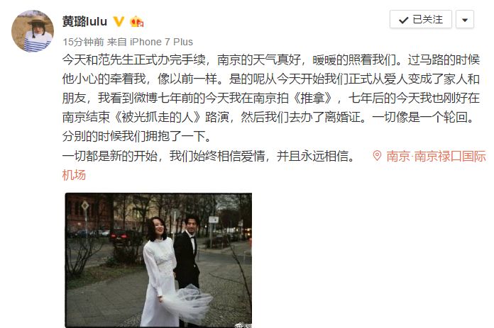 原标题:黄璐宣布和范玮离婚,离婚后还是朋友,分别时还相互拥抱