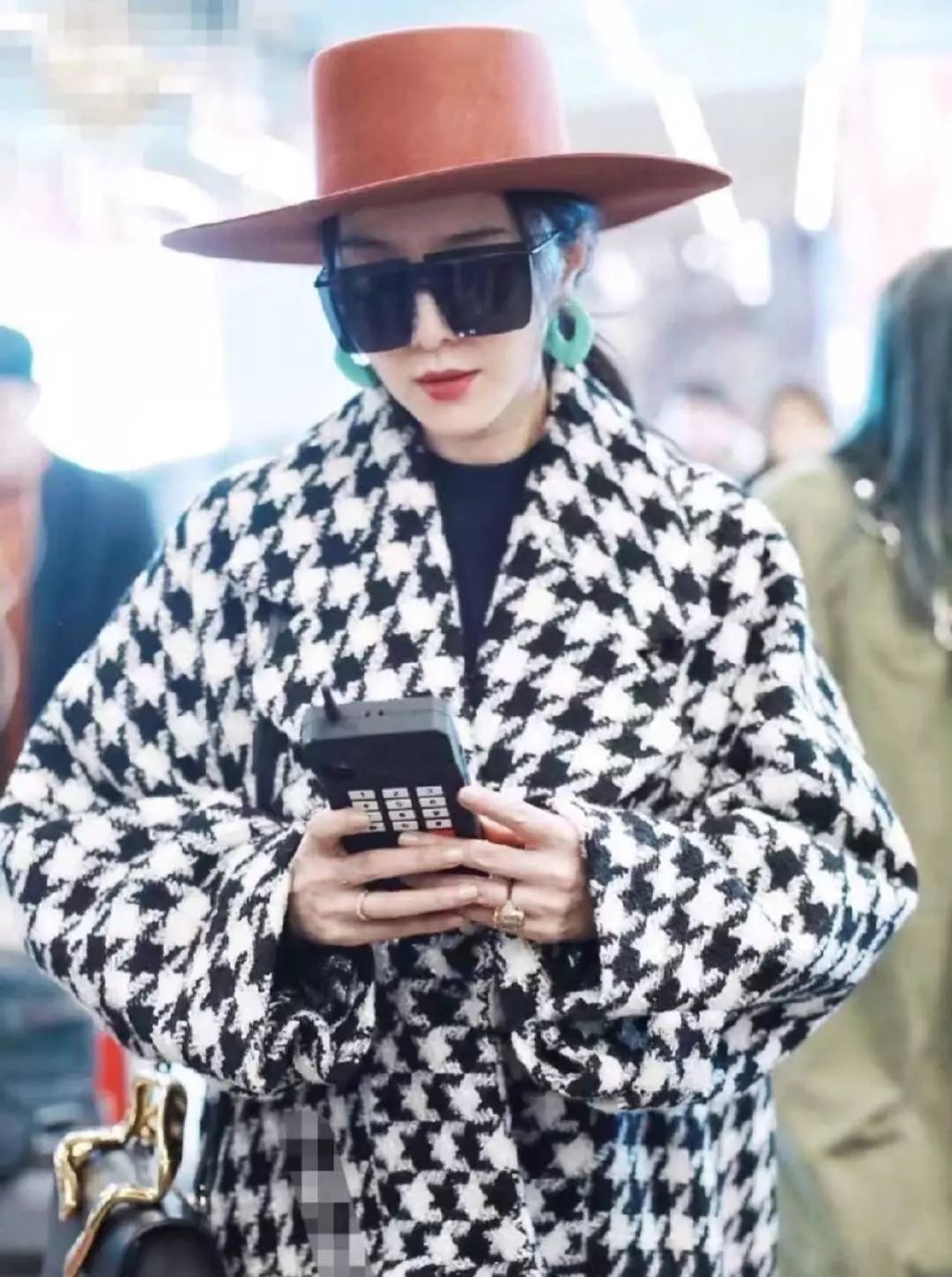 只见范冰冰身穿一件千鸟格过膝呢子大衣,脚踩厚底鞋,黑超遮住了大半张脸,搭配一顶橙色大礼帽和翡翠绿色的大耳环,整一个度假风,推着行李箱走路的样子也非常优雅,丝毫不见狼狈。小8觉得,大概是结束了在美国洛杉矶为电影《355》后期配音的工作,范冰冰心情也是无比的愉悦吧,一路上和妈妈有说有笑的。