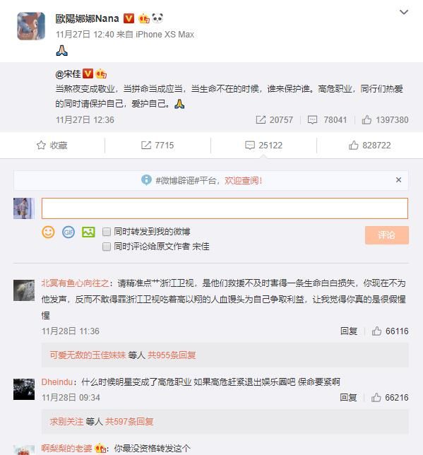 欧阳娜娜及时转发了宋佳的微博,并且配上祈祷表情,没想到她的这一个小举动却引来众怒,因数她的内容完全偏离了高以翔猝死的重点,而且给人一种用别人的死亡为自己谋福利,把自己的利益建立在他人生命之上的感觉,另外她将演员定义为高危职业,网友们无法认同,比起消防员,警察,以及那些高空作业人员,宋佳哪来的勇气说演员是高危?