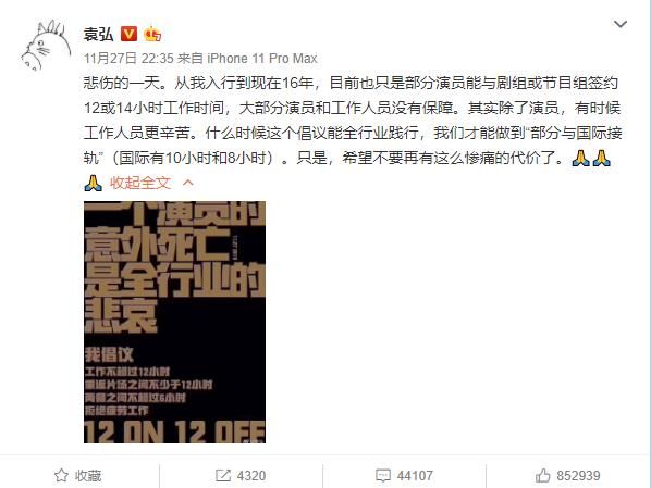 另外袁弘配图“一个演员的意外死亡,是整个行业的悲哀”则模糊了高以翔猝死的焦点,因为高以翔并非因为“超时”或“疲劳工作”去世,而是节目组没有做好安全保护措施,在高以翔晕倒时没有及时进行有效的抢救。