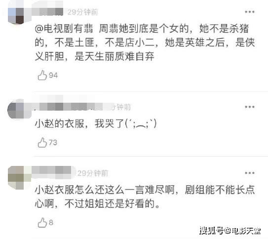 不过赵丽颖的服装造型还是一如既往的丑啊,有粉丝留言称“周翡她到底是个女的,她不是杀猪的,不是店小二,不是土匪,她是英雄之后,是侠肝义胆,是天生丽质难自弃”多次反抗之下,剧组依旧没什么长进,也难怪粉丝会如此声嘶力竭了。