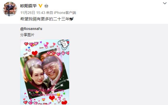 两人结婚23年,每年的结婚纪念日,都会在微博上庆祝,而且庆祝的方式也很少女心。
