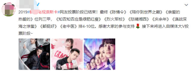而最近这一周网友们努力打投的结果也终于可以展示在我们的眼前了,网友票选出来的前三部剧分别是《陈情令》《陪你到世界之巅》《亲爱的,热爱的》,加上后面的《知否知否应是绿肥红瘦》《烈火军校》《怒晴湘西》《庆余年》《谍战深海之惊蛰》《都挺好》《老中医》,一共是排名前十的影视剧。