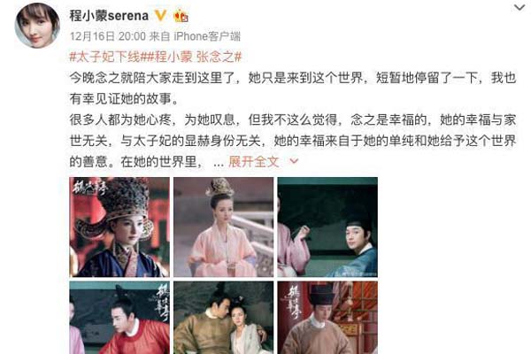 昨晚,《鹤唳华亭》更新后,程小蒙发文感慨:“在《鹤唳华亭》这部剧里,张念之就是这样一个人,一个美好的存在,虽然她的一生很短暂,但她相信她感受到了爱和真心,只是单纯去相信,就够了。感谢你们能和念之相遇,也感谢喜爱她的你们,张念之虽没法继续陪着大家,但《鹤唳华亭》的精彩还在继续!”