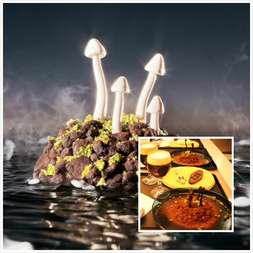 由椰子布丁制成的“未来人类”系列的“耳朵”,外面是椰子布丁,里面包裹着的夹心是抹茶巧克力和南瓜红丝绒蛋糕,口感层次丰富。两个颜色各异的“香蕉”则分别由抹茶奶冻和椰子奶冻制成,吃一口椰子味的“香蕉”,再吃一口抹茶味的,两种奇妙的口感,交相融合,让人过口难忘。