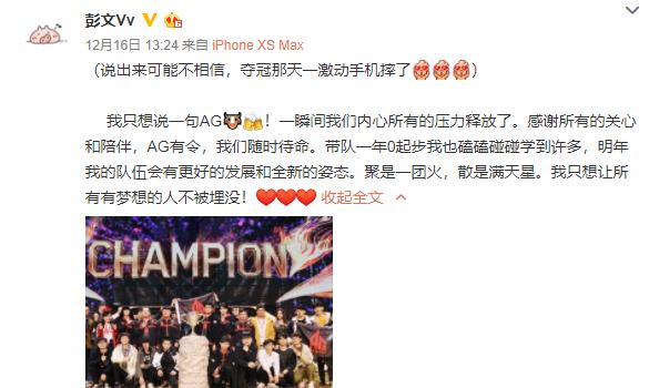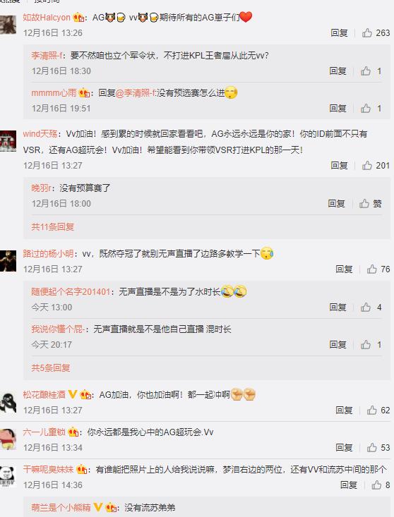 当然,对于AG超玩会,Vv也是一直在关注的,虽说很少公开发声了。在AG超玩会斩获冠军的历史性一刻时,Vv也是忍不住终于发声了,一句AG有令,随时待命。可以的!