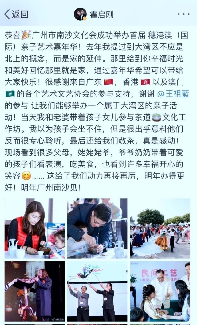 12月18日,霍启刚公开他与太太郭晶晶带着一子一女到南沙参加亲子活动的照片,其中两岁女儿霍中妍首度曝光,她果然长得像妈妈,皮肤白皙十分可爱。最小的女儿还没有满一岁,所以被父母留在了家里。