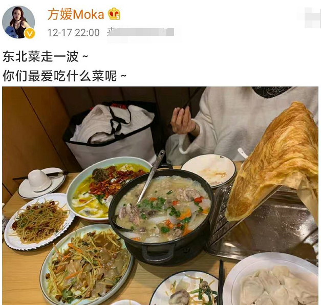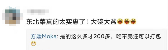 网友在看到方媛晒照后,留言称东北菜大碗大盆太实惠,随后方媛回复网友留言,大赞这顿饭价格便宜,满满一桌子菜只花了两百多,而且还开心说吃不完可以打包。