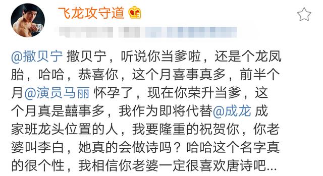 飞龙在得知撒贝宁在这段跨国恋中升级当了父亲,心里也替他感到高兴,他打趣地隔空喊话撒贝宁写到:“撒贝宁,听说你当爹啦,还是个龙凤胎,哈哈,恭喜你,这个月喜事真多,前半个月演员马丽怀孕了,现在你荣升当爹,这个月真是囍事多,我作为即将代替成龙成家班龙头位置的人,我要隆重的祝贺你,你老婆叫李白,她真的会做诗吗?哈哈这个名字真的很个性,我相信你老婆一定很喜欢唐诗吧...”