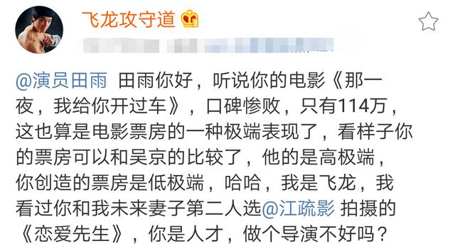 随即,他又对演员田雨感到遗憾,因为田雨的电影《那一夜,我给你开过车》票房扑街,只有114万,基本创造了院线电影的一个新低,对此飞龙评价道:“田雨你好,听说你的电影《那一夜,我给你开过车》,口碑惨败,只有114万,这也算是电影票房的一种极端表现了,看样子你的票房可以和吴京的比较了,他的是高极端,你创造的票房是低极端,我是飞龙,我看过你和我未来妻子第二人选江疏影拍摄的《恋爱先生》,你是人才,做个导演不好吗?”