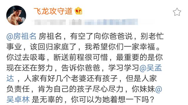 最后,自认为是成龙接班人的飞龙,又对成龙和他的儿子房祖名提出了批评:“房祖名,有空了向你爸爸说,别老忙事业,该回归家庭了,我希望你们一家幸福。你过去吸毒,断送前程很可惜,最重要的是你现在还在努力,告诉你爸爸,学习学习吴孟达,人家有好几个老婆还有孩子,但是人家负责任,肯为自己的孩子尽心尽力,你妹妹吴卓林是无辜的,你可以为她着想一下吗?”