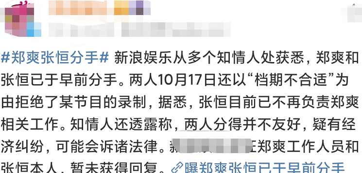 据媒体爆料,已经有多位知情人士透露郑爽与张恒早已分手,两人曾经被一档综艺邀约,双方以档期不合适为由拒绝。张恒早已不负责郑爽的工作,而且两人分手并不体面,双方面临经济纠纷,甚至今后会走法律程序解决,好聚不能好散,不禁令人唏嘘。