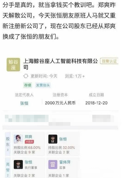 在节目未播完之前,郑爽与张恒就已经分手了,郑爽不仅将自己与张恒的情侣单品放到二手平台上售卖,还被爆料早就在招聘经纪人的消息。就连张恒都删除社交动态,节目完结后再未与郑爽同框亮相。两人合作的公司曾经郑爽是大股东,后来却变成了其他人,由此看来,两人关系早已变质。