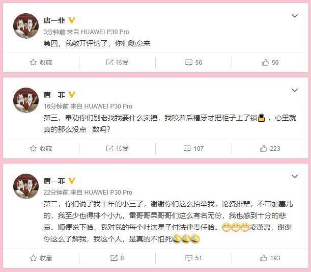 再后来,估计唐一菲知道出来参加节目就难得清静,于是淡出社交媒体多年的唐一菲,决定开微博怼网友,力破被小三的谣言。