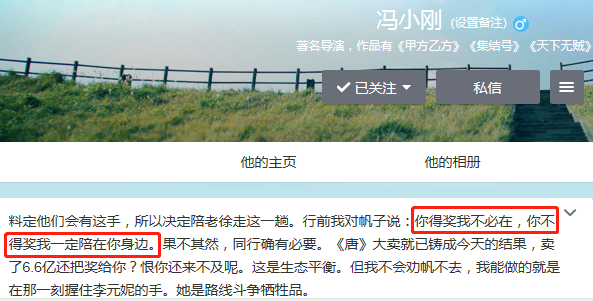 作为徐帆的“头号粉头”,冯小刚一直都对妻子徐帆的演技颇为自豪。当初徐帆凭借《唐山大地震》入围金马奖却错失最佳女主,冯小刚直接在社交平台开炮,像极了为偶像鸣不平的粉丝。
