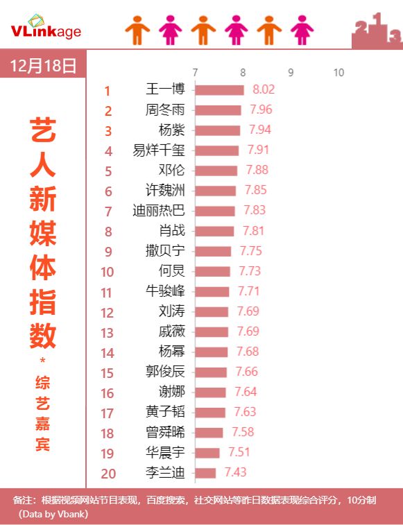 【寻艺指数】12月18日 #艺人新媒体指数# (综艺嘉宾)Top 20榜单:#王一博#,#周冬雨#,#杨紫#,排名前3位, #易烊千玺#,#邓伦#,#许魏洲#,分列4、5、6位。