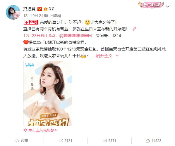 在昨天的冯提莫生日音乐会后,冯提莫也正式在微博上宣布独家签约B站,并将于12月23日晚8点首播,并配文“亲爱的蘑菇们,对不起![悲伤]让大家久等了!直播已有两个月没有营业,那就在生日来宣布新的开始吧!12月23日晚上8点,@哔哩哔哩弹幕网 房间号:1314;提莫牵手B站开启新的直播旅程。”