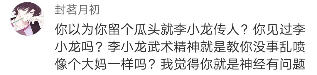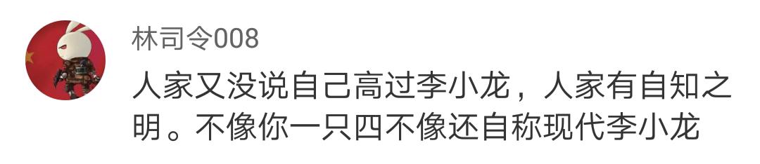 看完飞龙的隔空示威,影迷们留言回击道:“我感觉娱乐圈的人都是你亲戚,谁你都认识,谁的热度你的能曾上,多大的人了,脸再不值钱,也不能这样呀!你经常这样,你家人知道吗”、“你这是在侮辱咏春吗?”、“人家又没说自己高过李小龙,人家有自知之明。不像你一只四不像还自称现代李小龙”、“就算尿再黄,估计也兹不醒这飞龙了”、“卑鄙无耻之徒,小人得志,乱说,乱扯淡,你真是个瓜皮,什么话都敢说,道德沦丧”、“你以为你留个瓜头就李小龙传人?你见过李小龙吗?李小龙武术精神就是教你没事乱喷像个大妈一样吗?我觉得你就是神经有问题”、“你老婆应该挺喜欢给你头上带点绿的”、“哪有人这么傻,会嫁给四不像”。