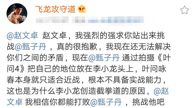 原标题:现代李小龙喊话赵文卓:我相信你能打败甄子丹,快去挑
