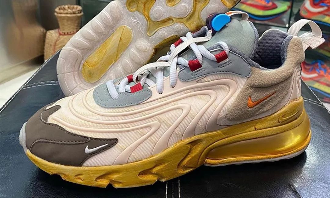 Travis Scott 现有联名鞋款中,没有一双市场价不「爆」的,这块金字招牌足以冲击 2019 年度 Sneaker 榜单。Air Max 270 React 尽管属于 Nike 主推款之一,不过市场反响相对平淡,自早前传出 Travis Scott x Nike 的下一双联名是 Air Max 270 React 后,很多人都表示不太理解。日前这双焦点合作款终于曝光完整谍照,米色鞋面搭配金黄色外底和棕色鞋头,红、蓝、灰等色点缀细节,熟悉的 Cactus Jack、笑脸元素延续,TS 设计语言「血统」纯正,预计会在 2020 年 3 月发售。但网友们对这双鞋似乎并不是太买账,认为和之前的 Air Jordan、Air Force 1 相差不少,这也给它能否延续「爆款」打了一个不小的问号。Travis Scott 系列还能否续写高价神话?明年见分晓。